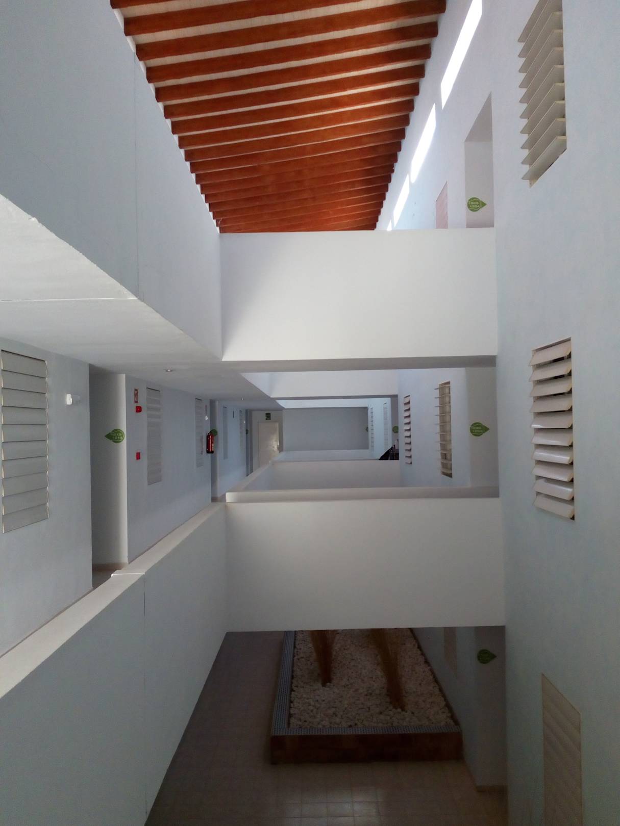 ZimmerIm Haupthaus. Das Treppenhaus. Es sind auch die Fenster mit den Holzlamellen der Schlafzimmer zu sehen.