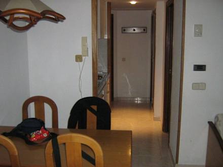 Blick vom Balkon auf den Esstisch und in den Flur.