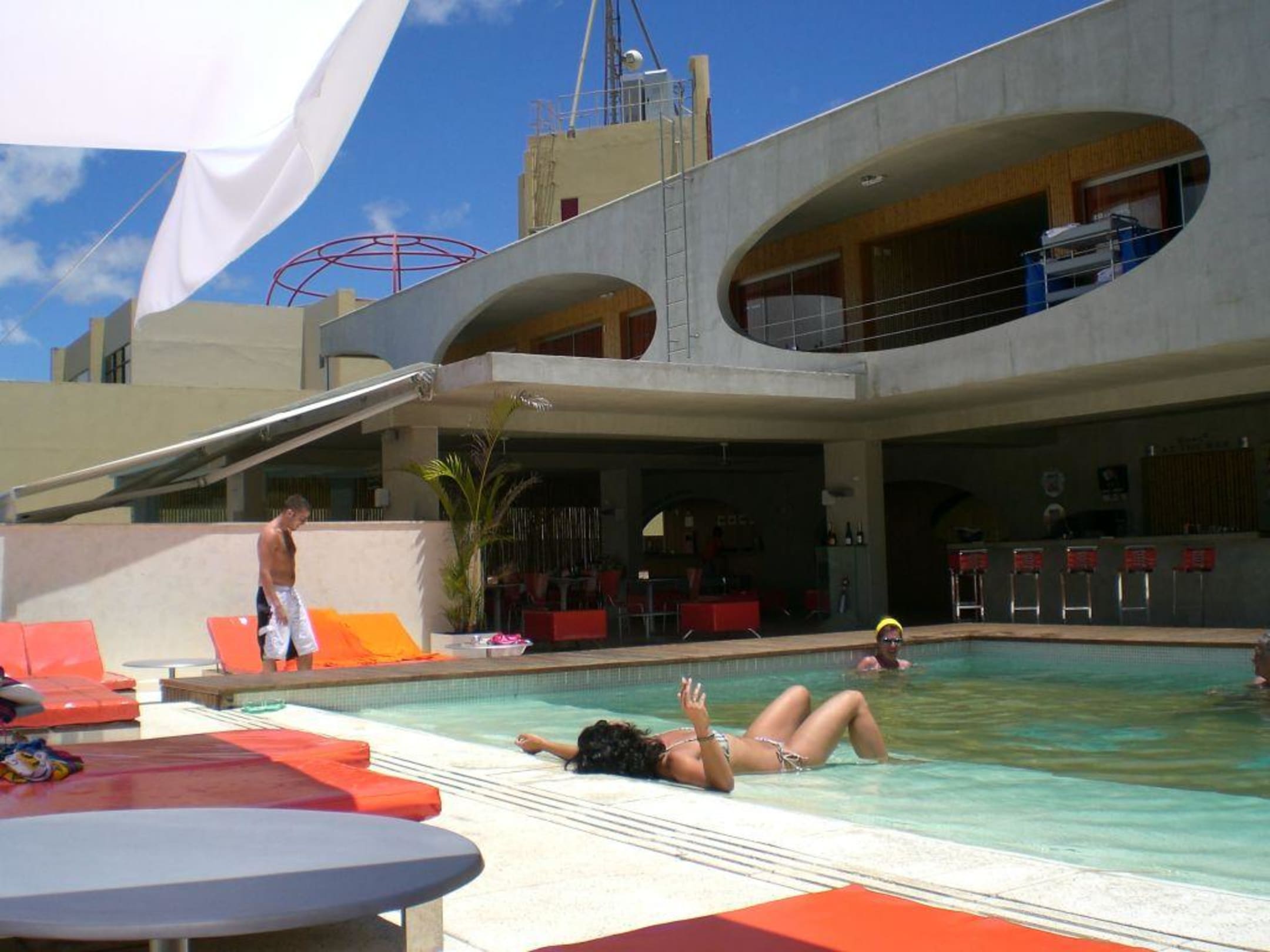 Blick vom Pool aus zum Restaurantbereich, im Hintergrund Rezeption