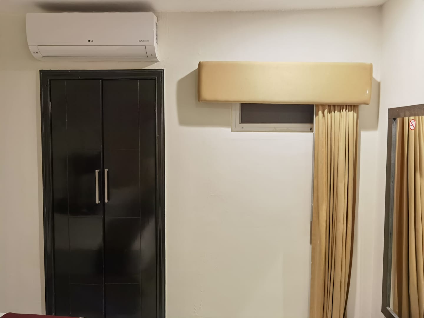 Ein kleines dekoratives Fenster. Insgesamt das Zimmer hinterlässt eine bedrückende Stimmung. Wegen der Nähe des Fahrstuhl gibt's keine Möglichkeit das Zimmer zu lüften, keine Privatsphäre.