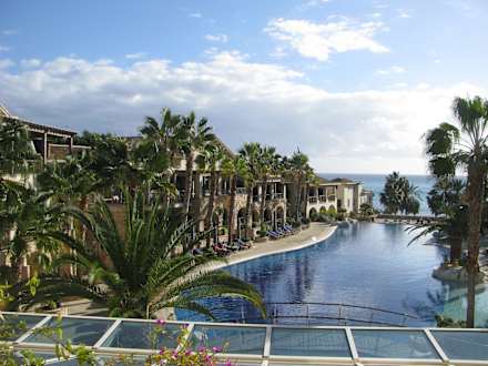 Blick aus der Lobby über den Pool zum Meer