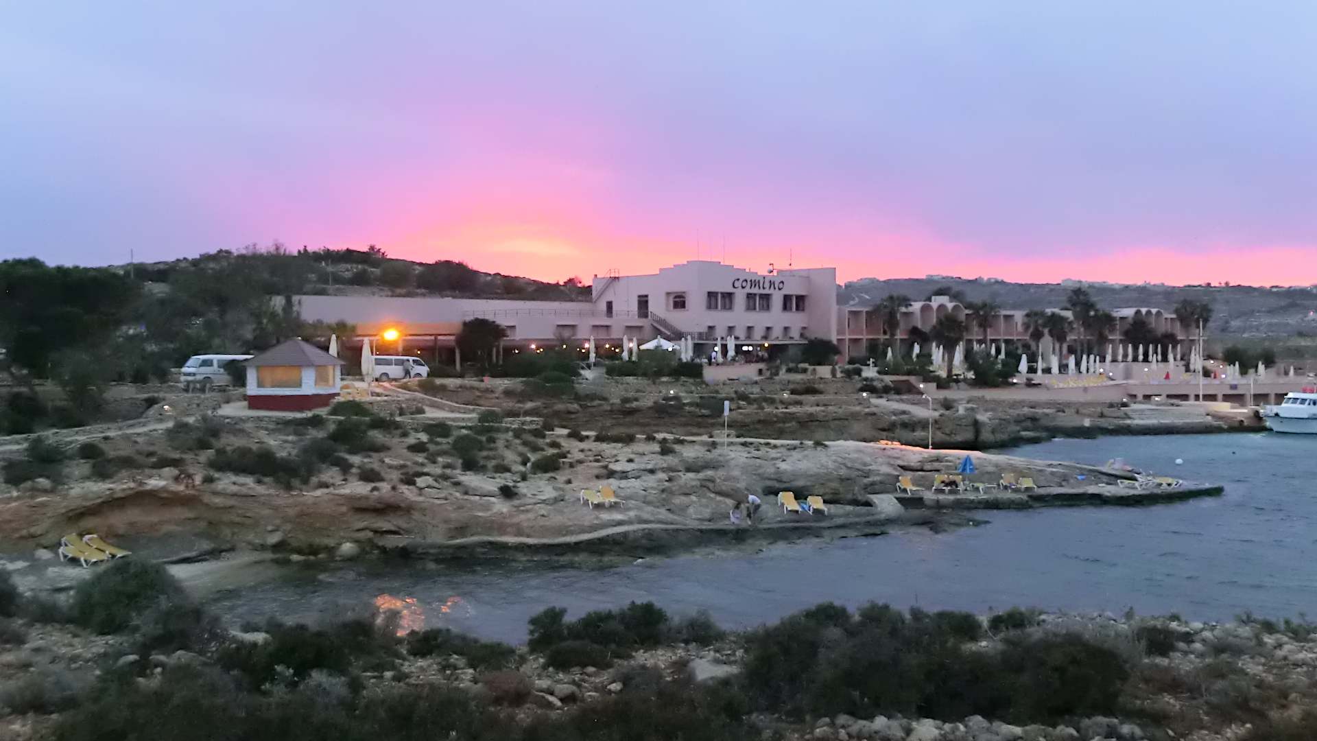 Comino Hotel mit Hotel - Strand im Abendrot, vom Gehweg zu den Bungalows aus.