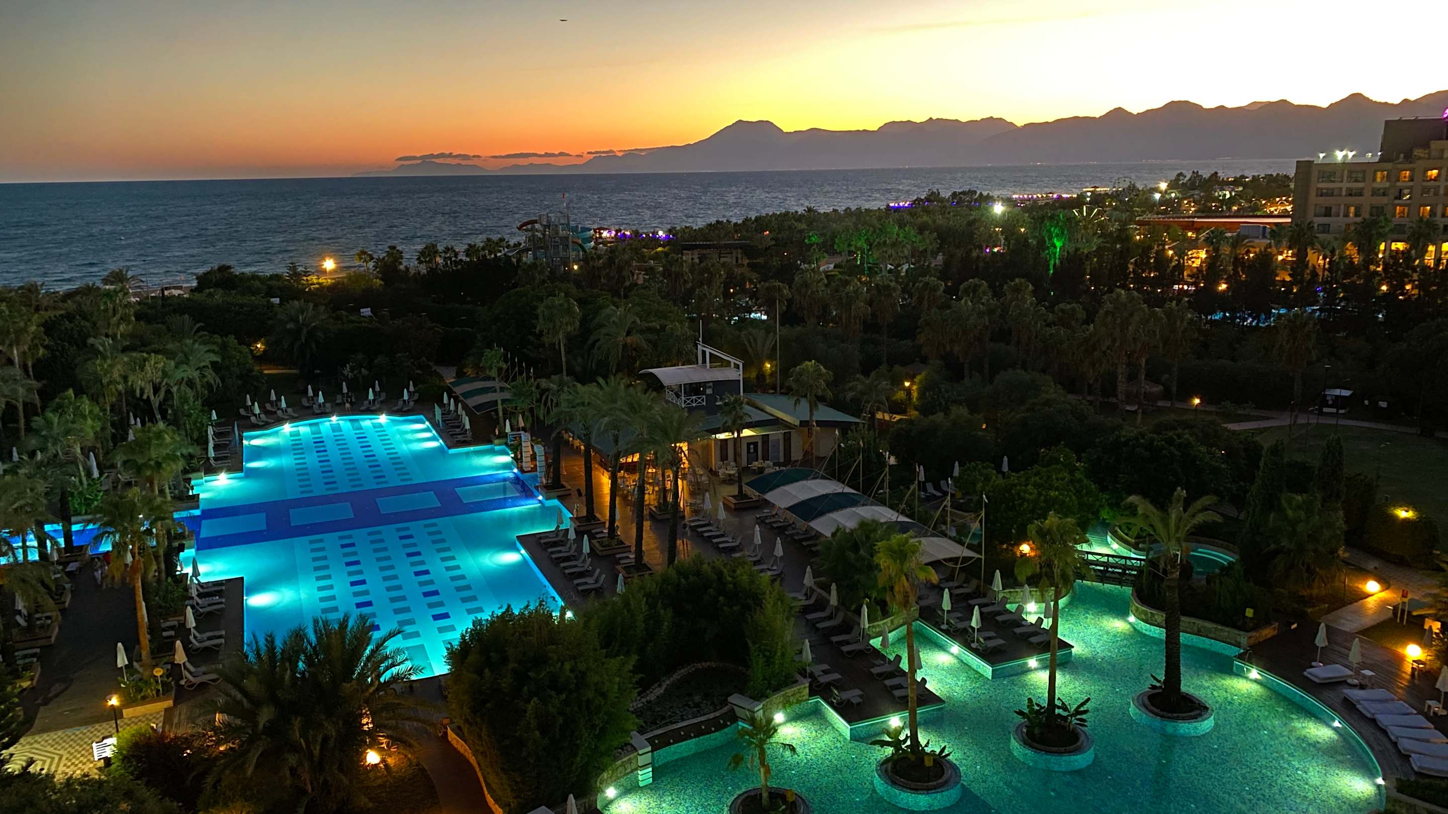 Ausblick vom Balkon auf die Pools und das Meer