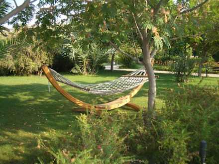 Eine von mehreren Hängematten, die in der Anlage verteilt sind.