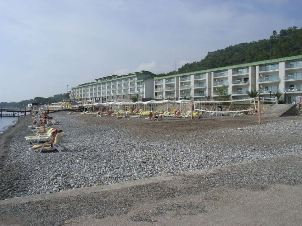 StrandDer etwas stark mit Kieseln und Steinen durchsetzte Strand. Rechts der Hotelkomplex.