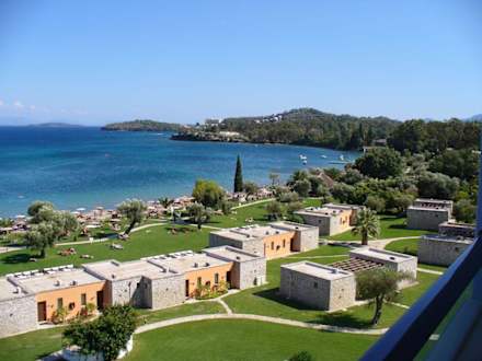 Blick aus Zimmer 520. Einige Bungalows und die Gartenanlage sind zu sehen. Die Parkanlage ist erst am Bootssteg zu Ende. Ab ca. der Mitte des Gartens befindet sich das Schwesterhotel Dassia-Chandris.