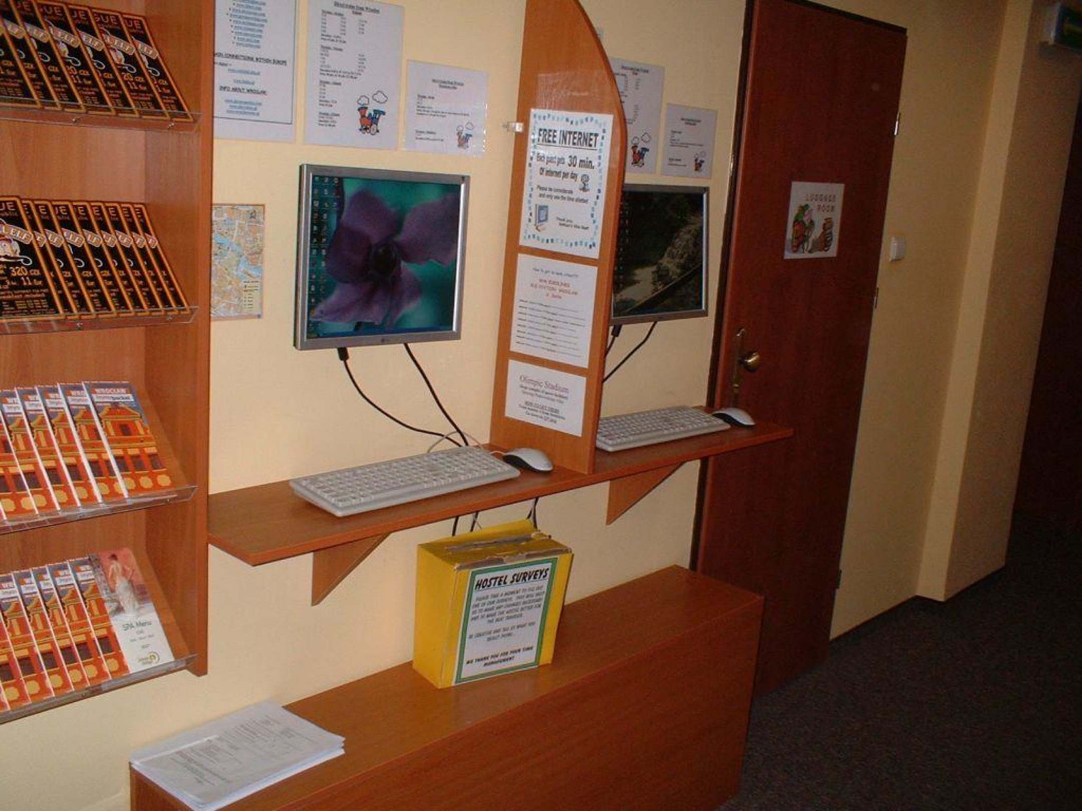 Hier zu sehen die 2 kostenlosen Internet-Terminals. Rechts daneben die Türe zum Gepäckraum, der immer schön abgesperrt ist ;-)
