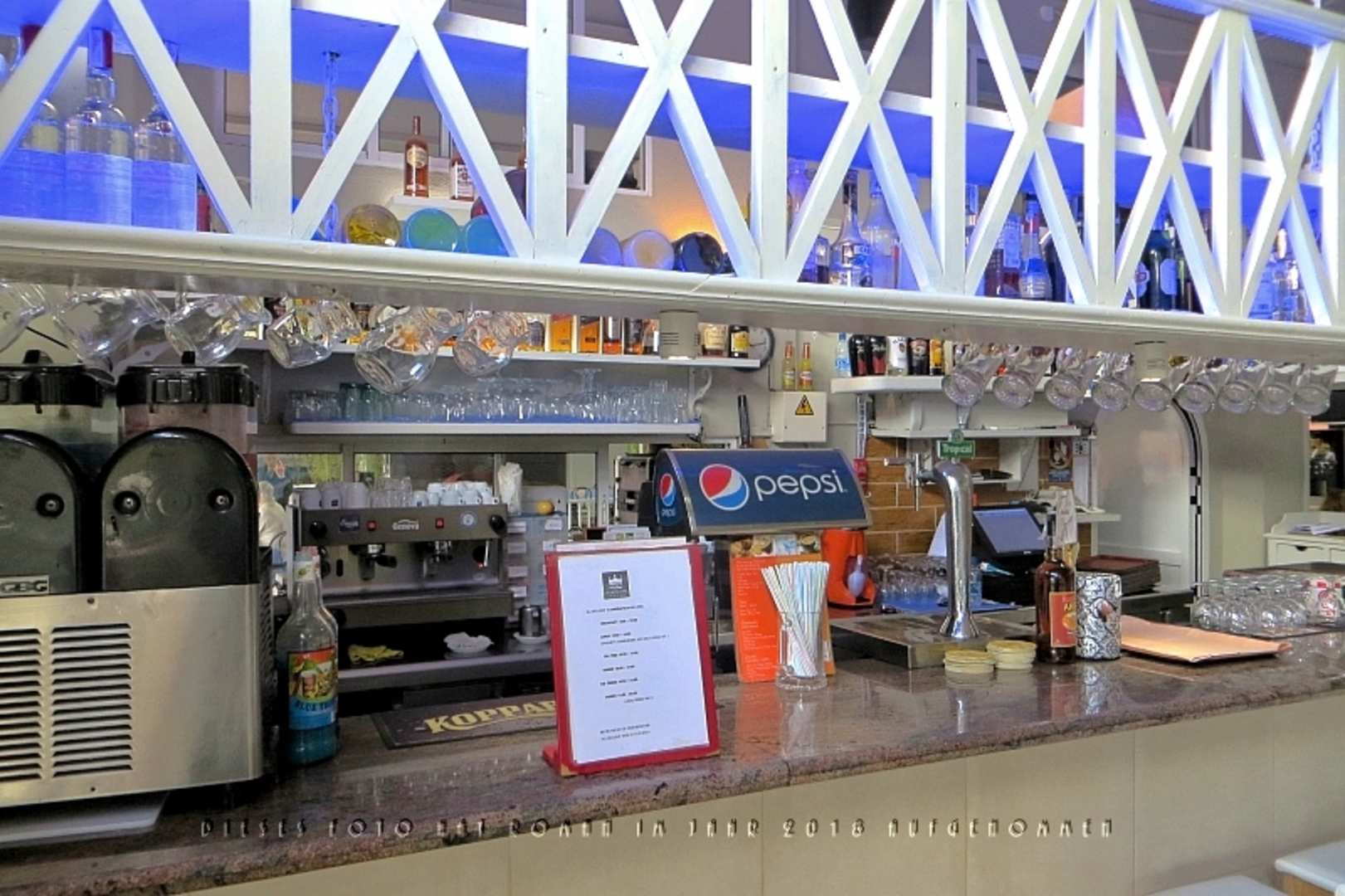 Die Bar. Diese Seite bekommt man zu sehen, wenn man vom Lift-Bereich zum Restaurant möchte. Ebenso, wenn man von der Pool- und Gartenanlage kommt.