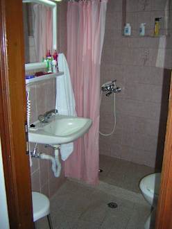 Kleinens Badezimmer mit Dusche, Waschbecken und WC