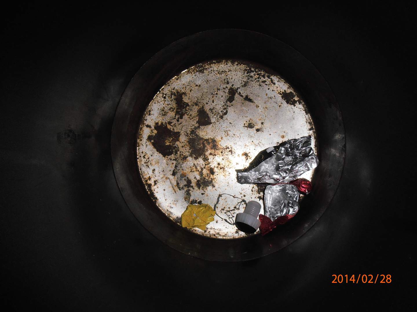 Der Mülleimerboden mit Rostflecken im Zimmer