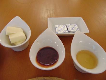 Frühstücksbestandteil: Honig, Erdbeermarmelade, Streichkäse und Butter