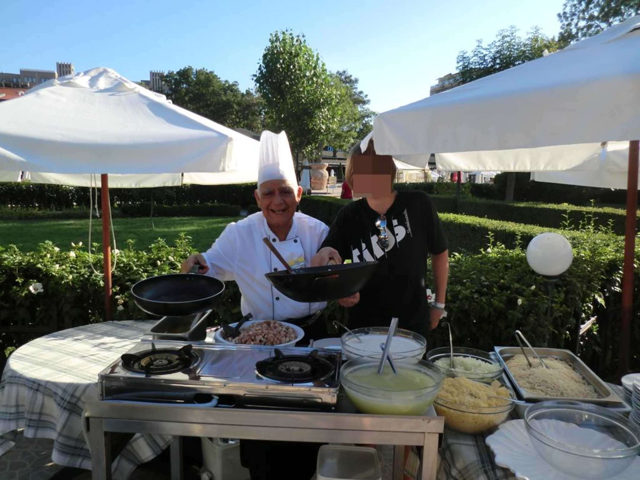 Koch bereitet leckere Nudelgerichte draußen zu