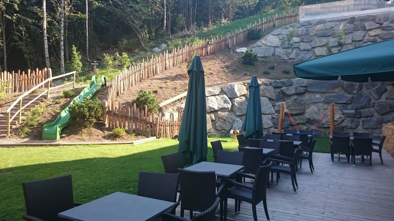 Terrasse und Garten mit Rutsche und Naschgarten