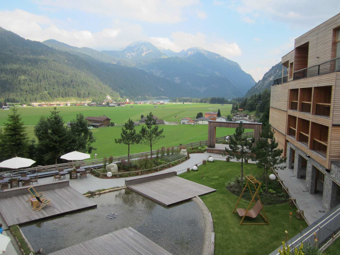 Blick vom Zimmer auf die Terrasse und den Achensee