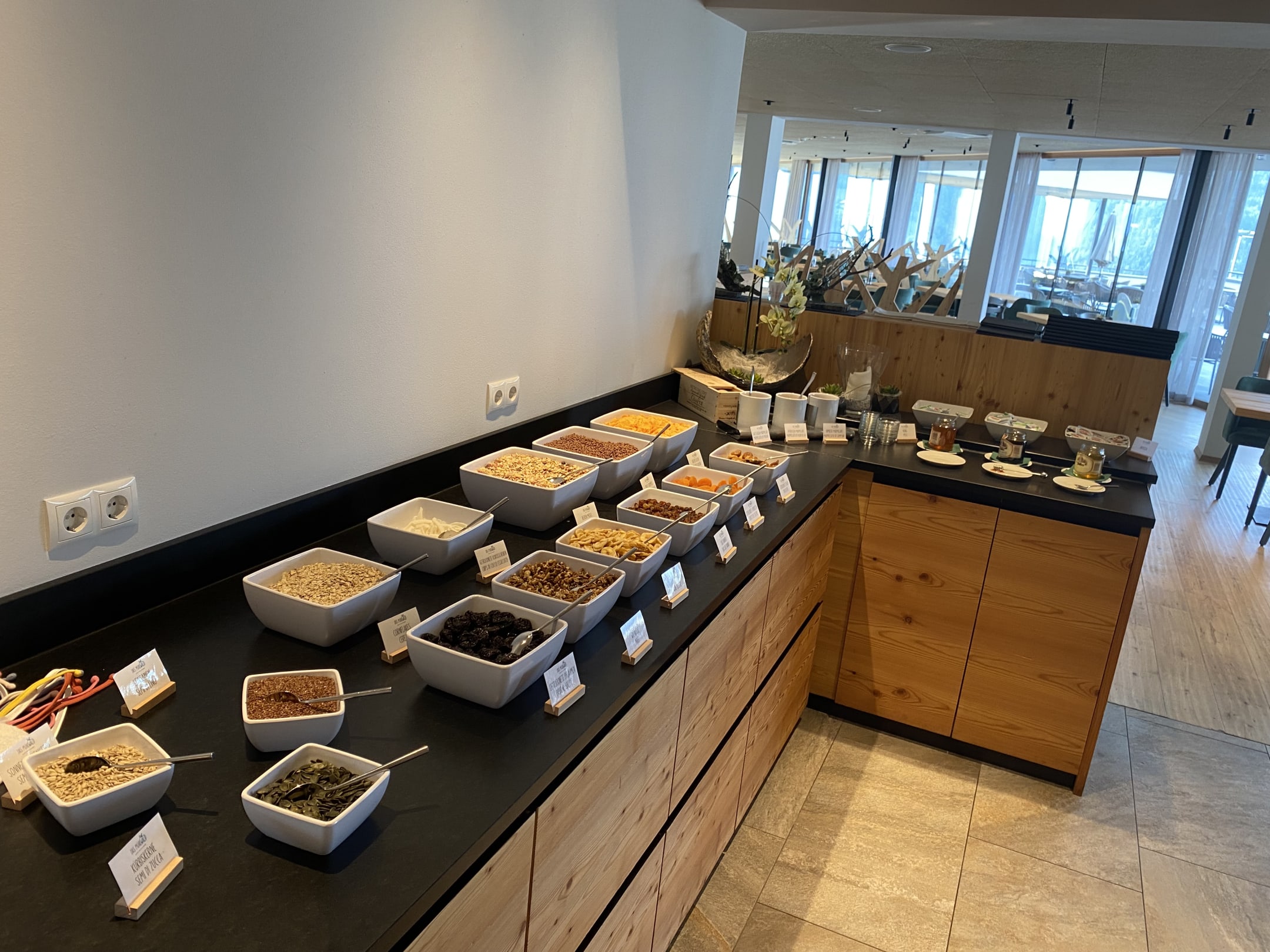 Müslis-Station mit getrockneten Früchten (Banane, Kokosnuss, Aprikosen,..)