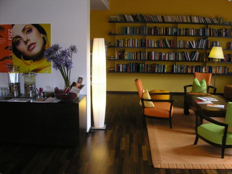 Im Ruhebereich steht eine Bibliothek zur Verfügung. Des weiteren stehen Getränke für Gäste, die Wellness in Anspruch nehmen zur Verfügung ( links im Bild ). Der freundliche Raum ist etwa 45 m² groß.