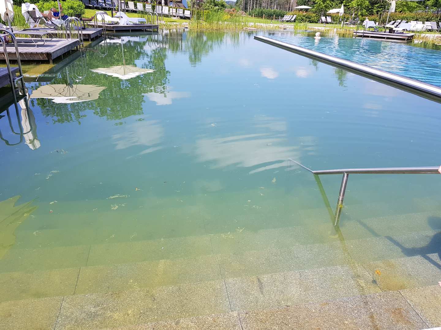 Schwimmteich, sehr schön zum Abkühlen und um den Infinitypool zu schwimmen. Bei 33 Grad Außentemperatur kam uns der Teich als tolle Abkühlung sehr gelegen. Nur die Treppen waren an manchen Stellen etwas rutschig durch die leichte Algenbildung.