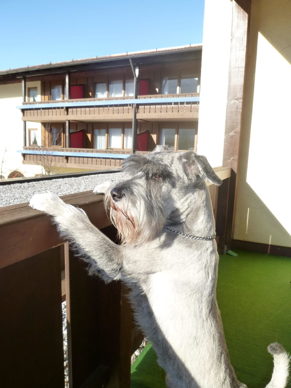 Unser Hund schaut sich die Berge auf dem Balkon an