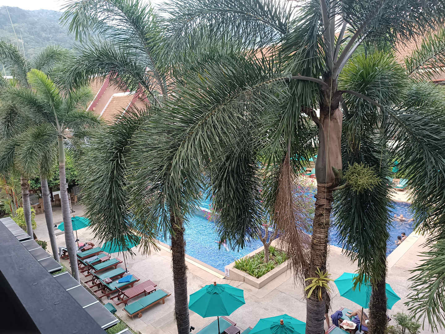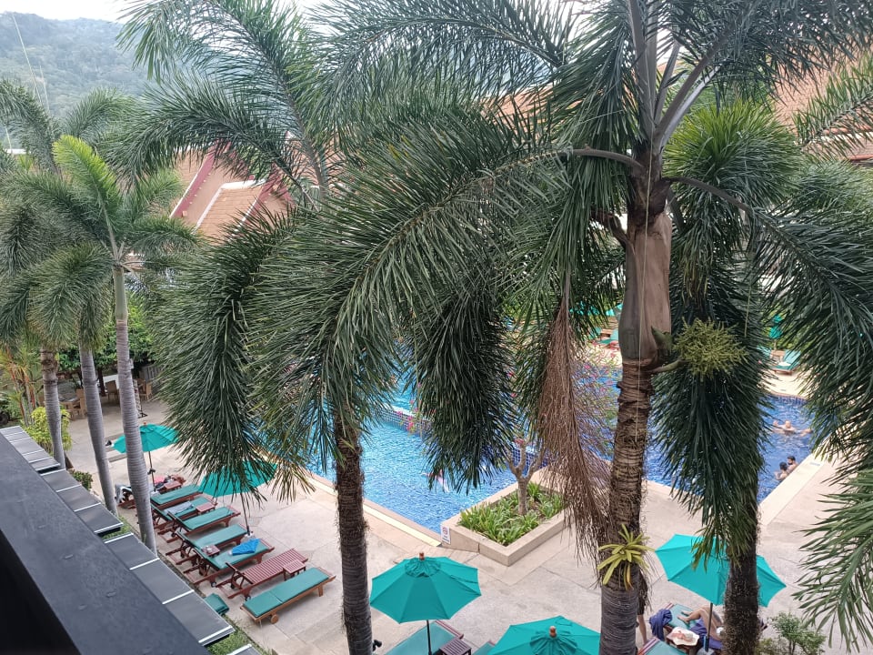 Blick vom Balkon auf einen Pool mit Poolbar