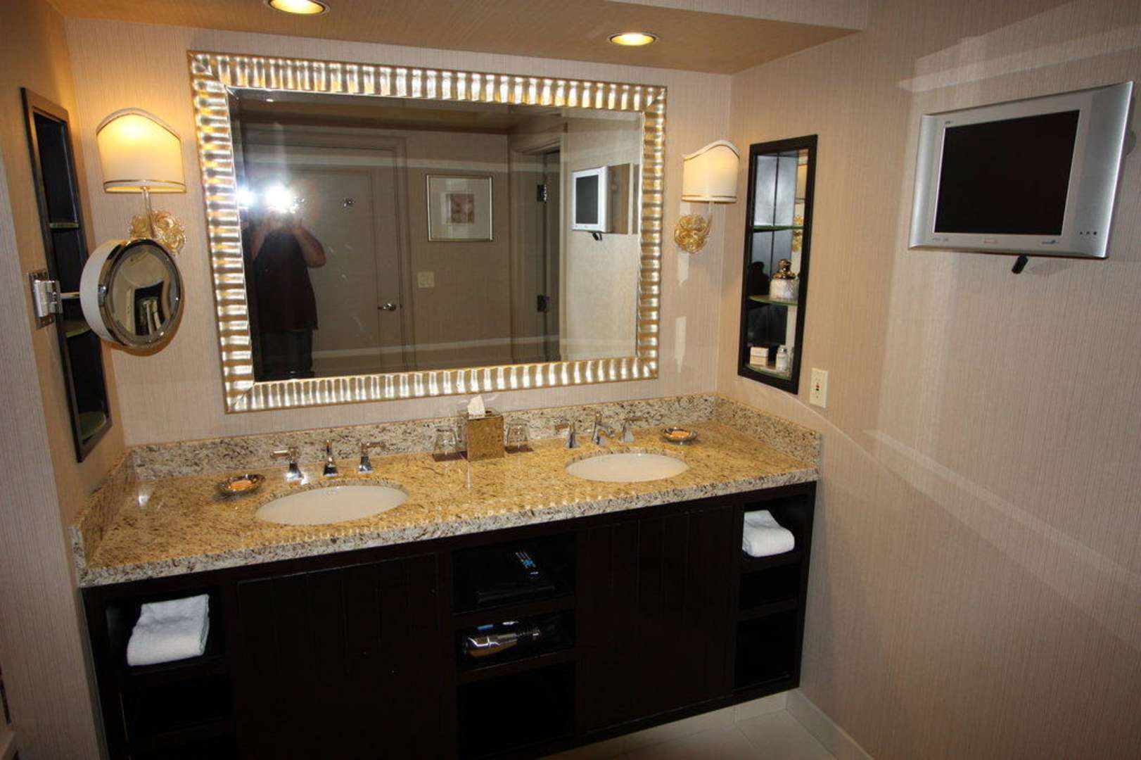 Blick ins Luxusbad des THE Hotels, Las Vegas. Man beachte den Flatscreen-Bildschirm.
