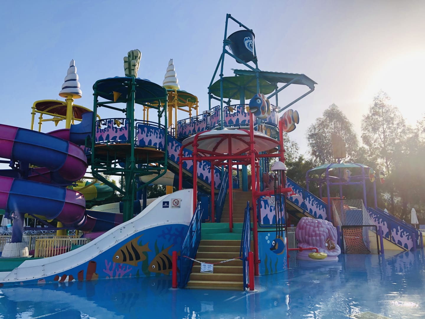 Kinder Rutschen Pool bei Sonnenaufgang.