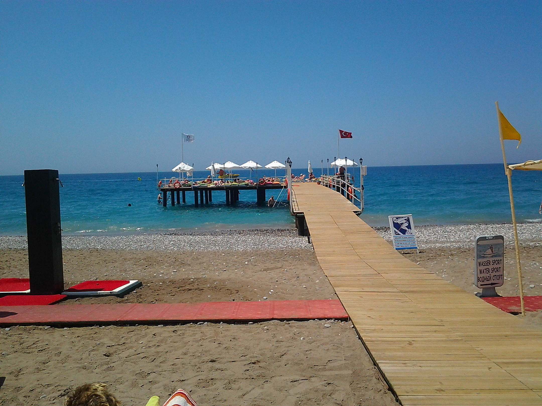 Weg zum Strandalles mit holz oder Teppich wegen den steinen und auf dem steeg extra dicke kissen und schaumstoffliegen und drei leitern für schwimmer