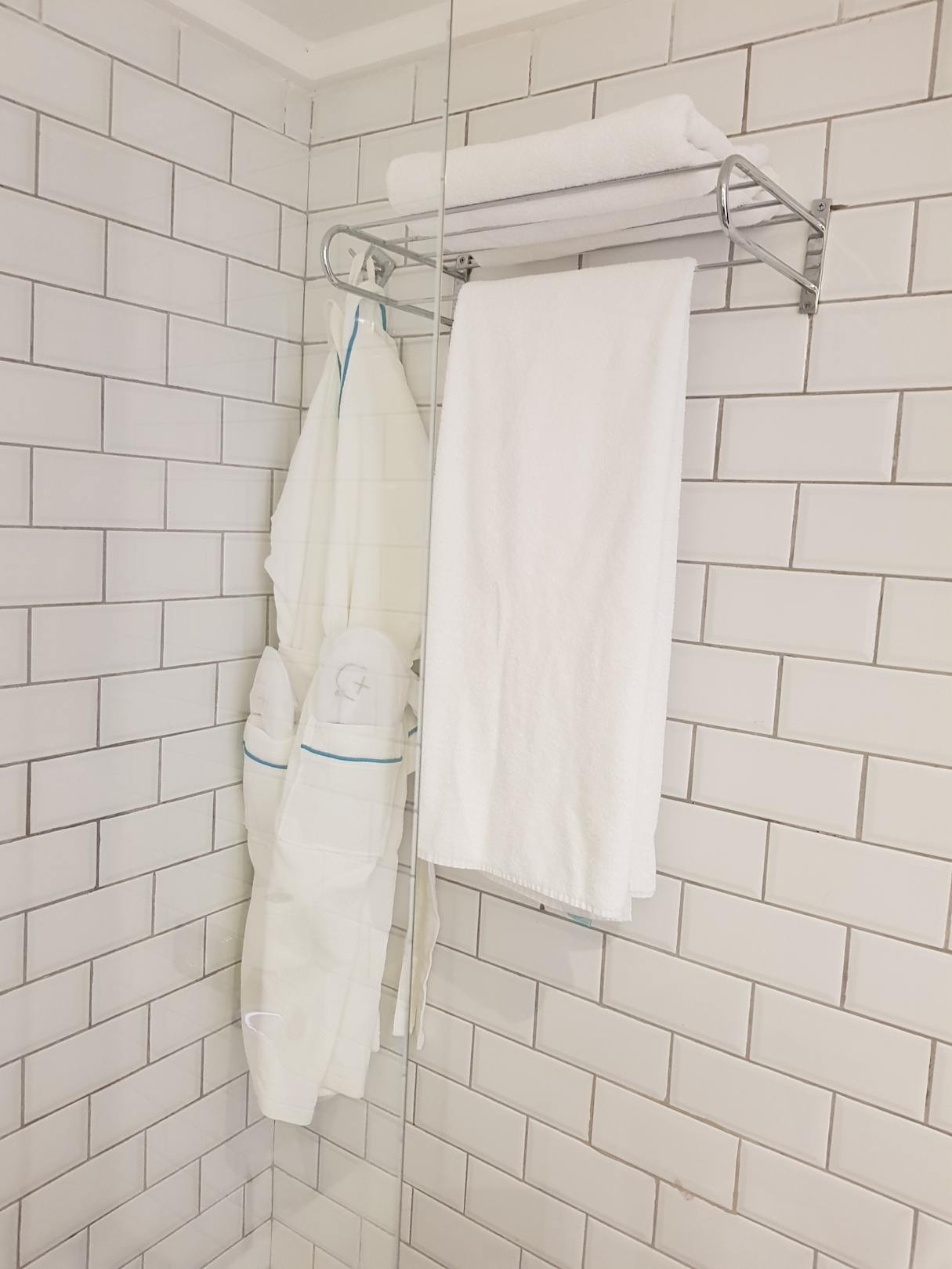 Badezimmer in moderner Metrokacheldesign. Bademantel, Hauschuh vorhanden