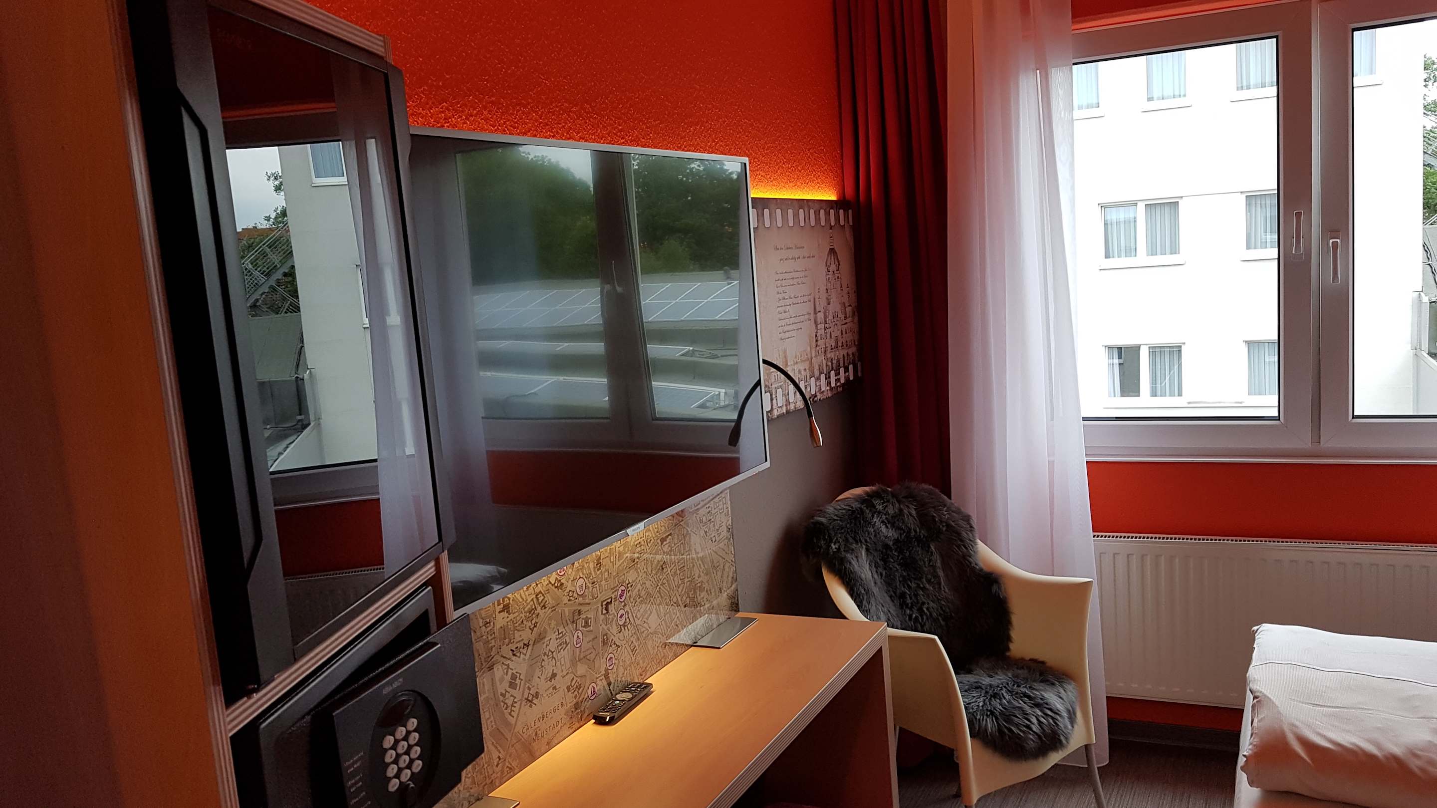 Vorne links der Kühlkschrank und darunter der Safe