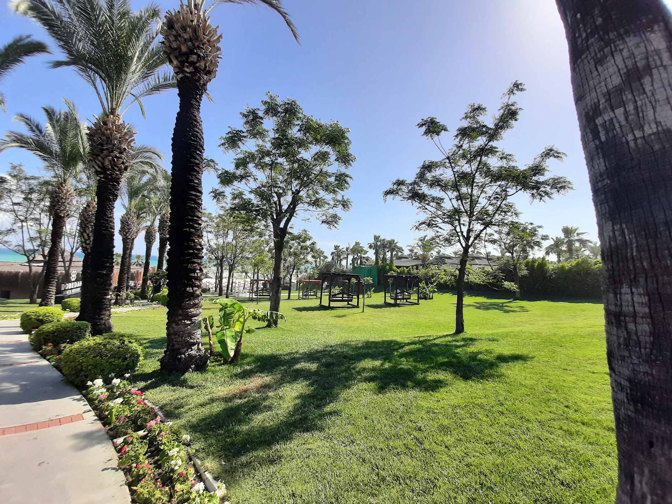 Hollywoodschaukeln im Gartenbereich Richtung Strand.