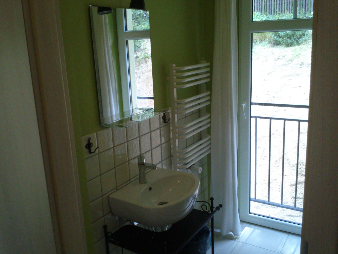 Przestronna łazienka z drzwiami balkonowymi