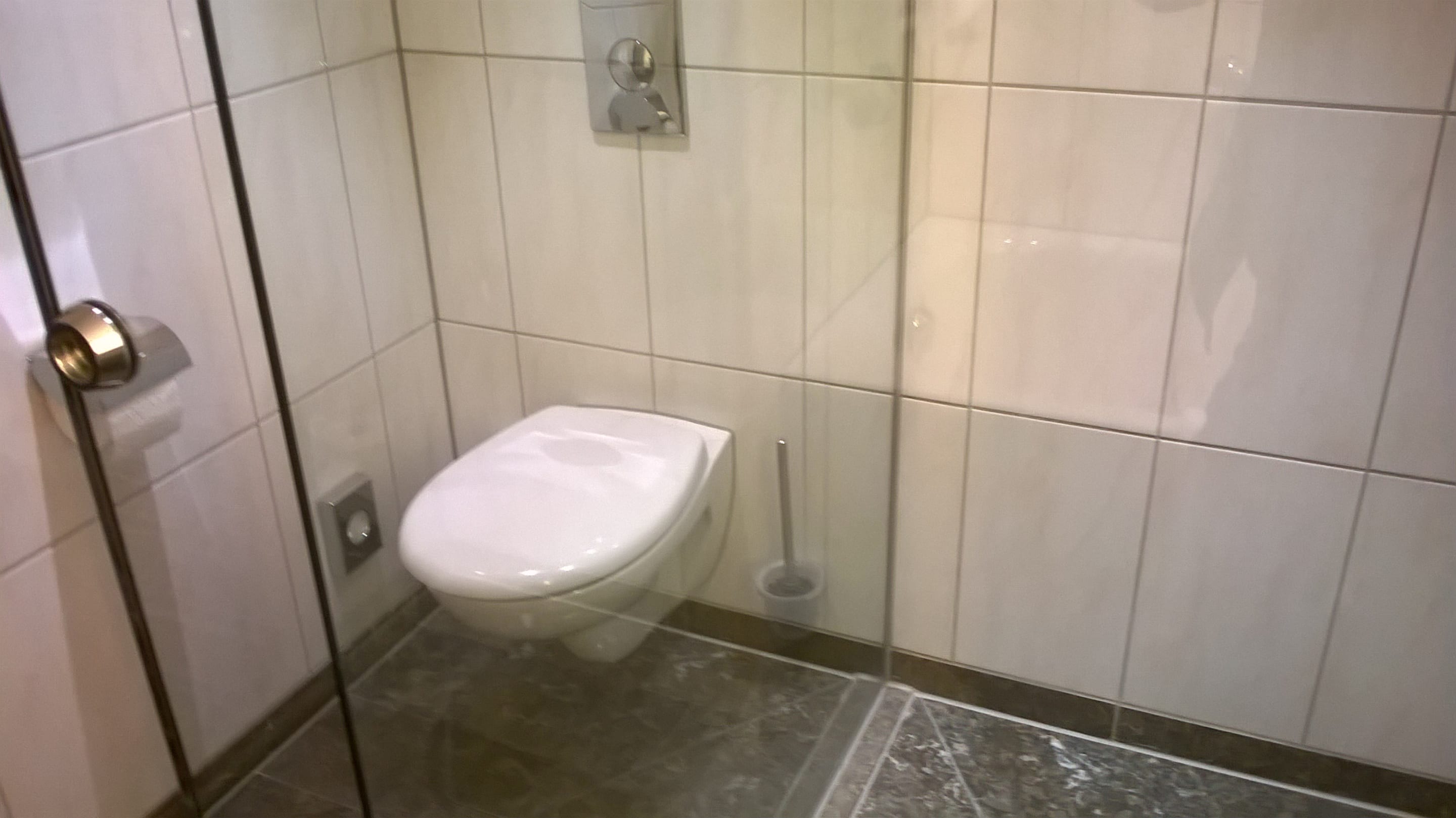 Bad, rechts ebenerdige Dusche, links WC