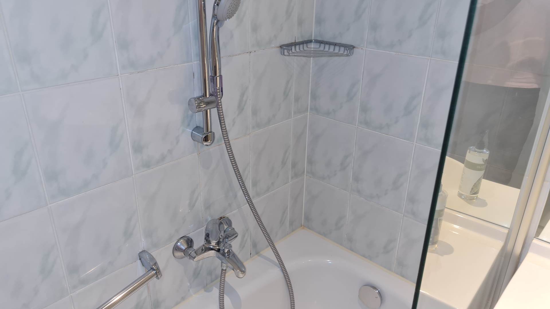 Verschmutzte Fliesenfugen und Kanten.