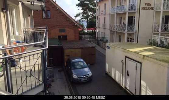 Aussicht vom Balkon Zimmer 116 auf benachbartes Fischrestaurant mit Entlüftung auf Hotelseite, auf den Kühlcontainer mit Kühlaggregat direkt vor dem Balkon und der Lieferanteneingang....
