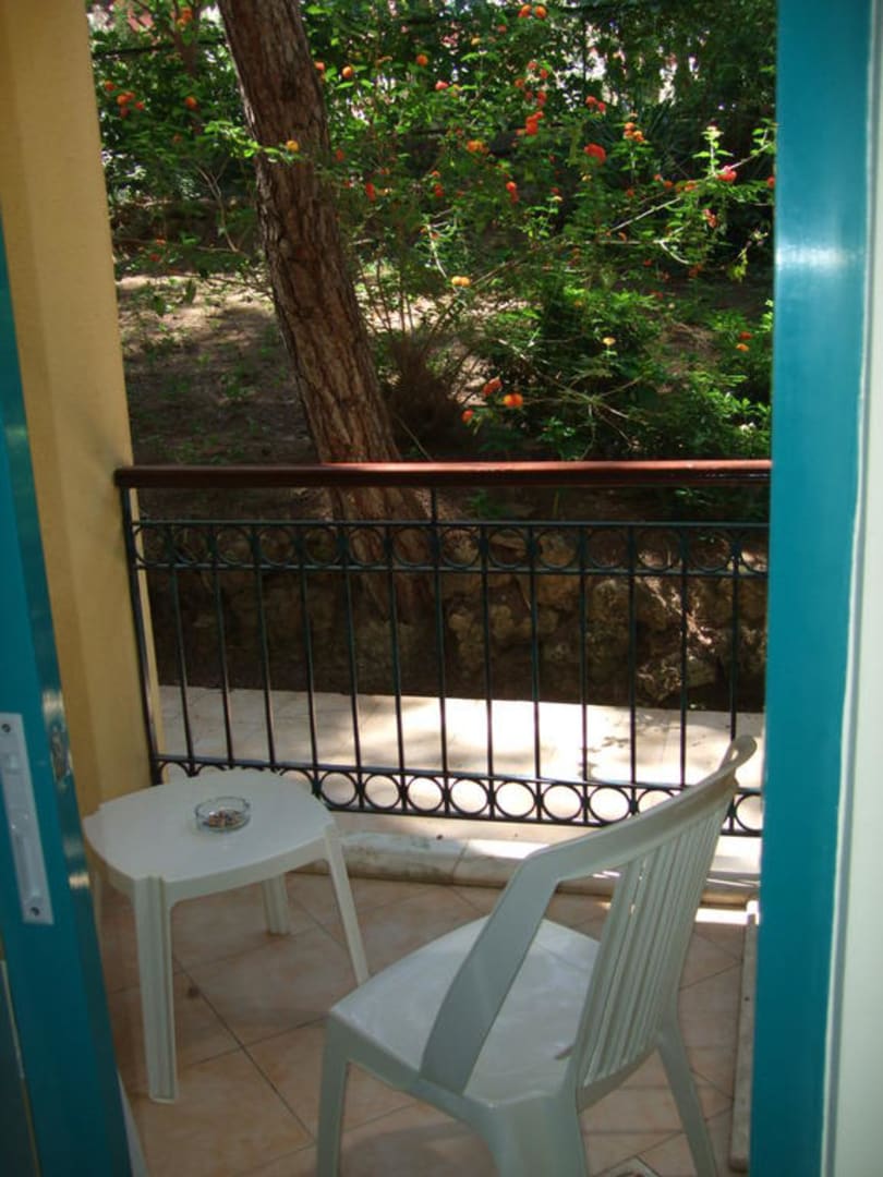 Diese Bild wurde mit Blitz ausgelöst, da es so dunkel war und im Zimmer war Licht an. Während des Tages sehr sehr dunkel wegen dem Erdwall vor dem Zimmer, morgens sehr viel Getier auf der Terrasse.