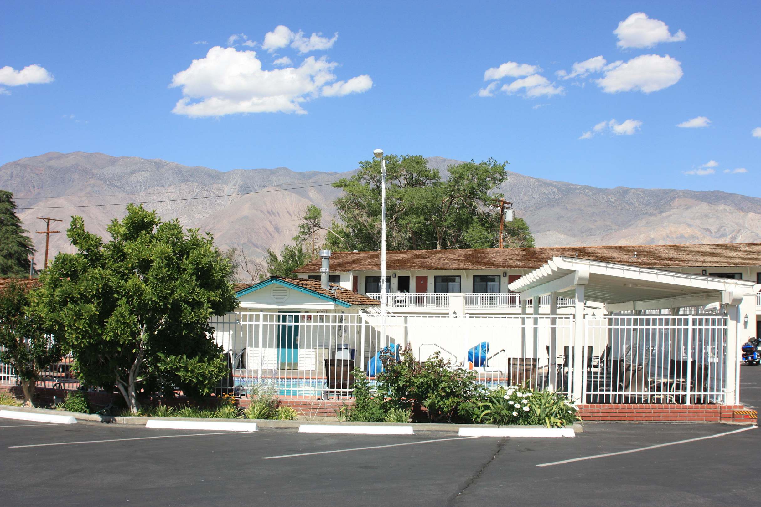 Poolanlage vom Parkplatz aus
