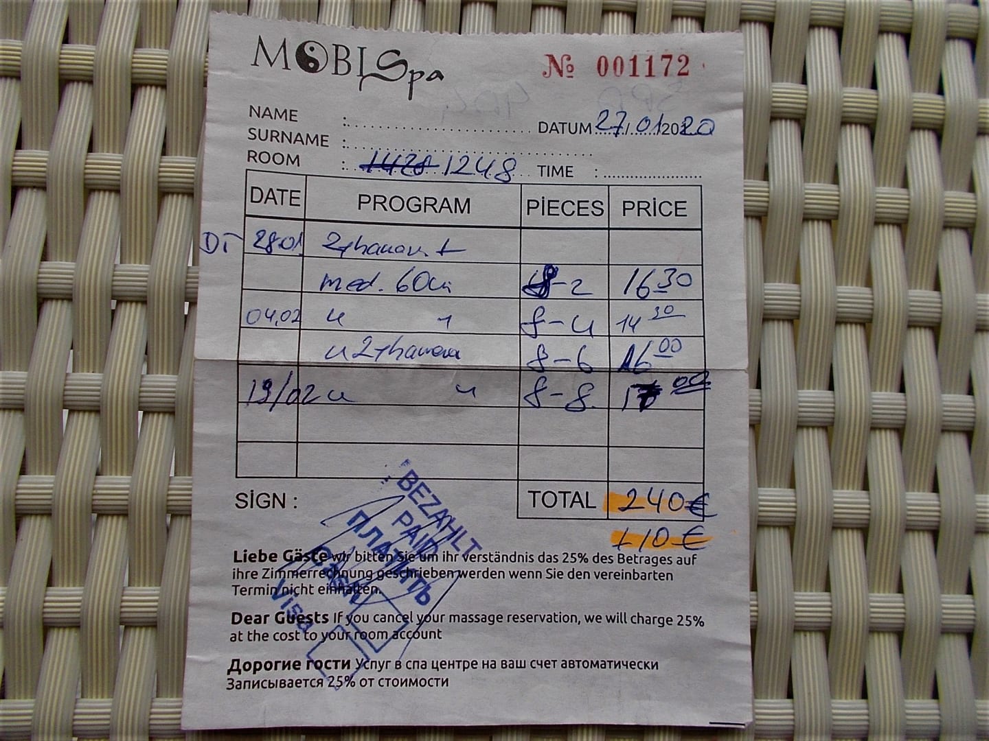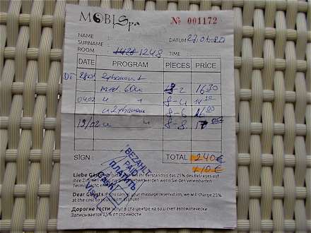 Die bezahlte Rechnung = 8 X Ganzkörpermassagen, 4 X Hamman = eine Behandlung dauerte je 2 Stunden. Für Daheim gab es noch 2 Rubbel-Handschuhe & eine Dose Körpercreme.