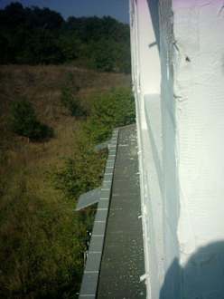 Die Außenwände werden nur noch durch Gewebematten und Gips zusammengehalten, ein Teil liegt auch schon unten. Kopf einziehen - auf dem Balkon. Nicht alles was von oben kommt ist auch gut