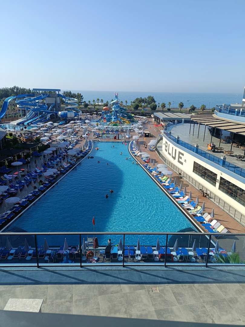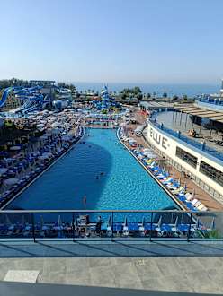 Blick vom Balkon auf den Pool und das Meer