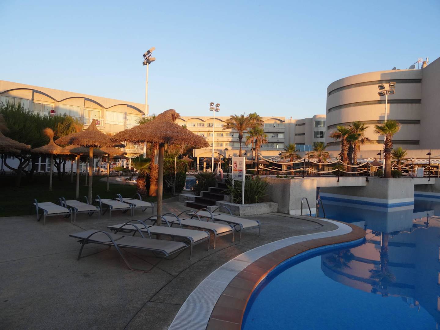 Pool und Hotel bei Sonnenaufgang