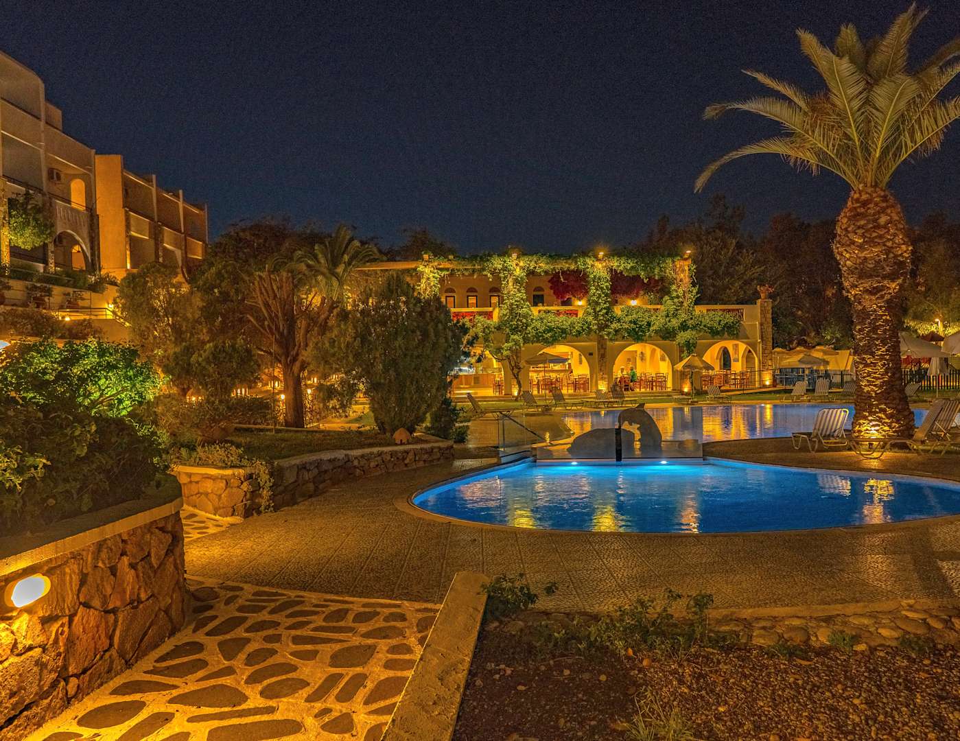 Hotel- und Poolbereich am Abend