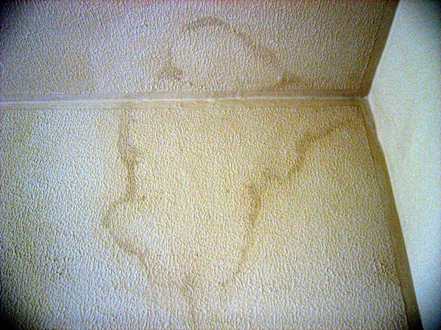 Vochtplekken op muur en plafond (boven het bed)