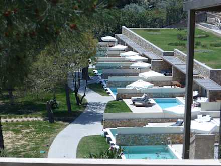 Blick vom Hauptgebäude auf die Villen mit eigenem Pool oberhalb des Ampelakia Beach