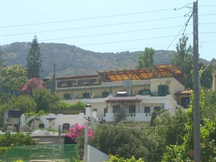 Widok z ulicy na główny budynek hotelu, u góry na tarasie jest jadalnia