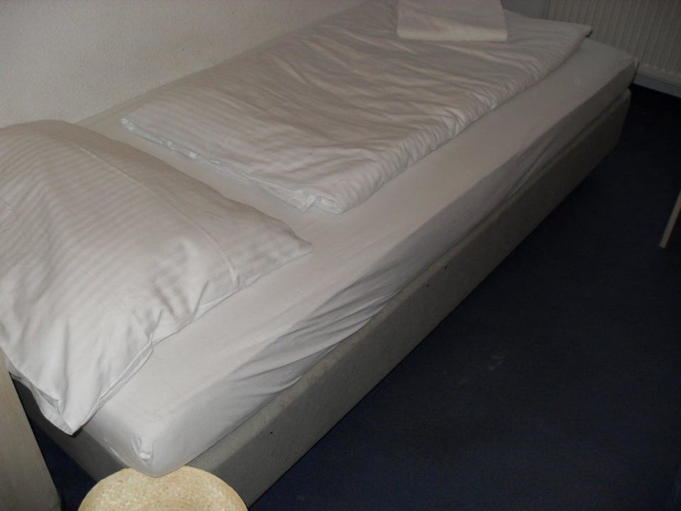 kaputtes, dreckiges Bett und fleckiger Teppich im Hotelzimmer