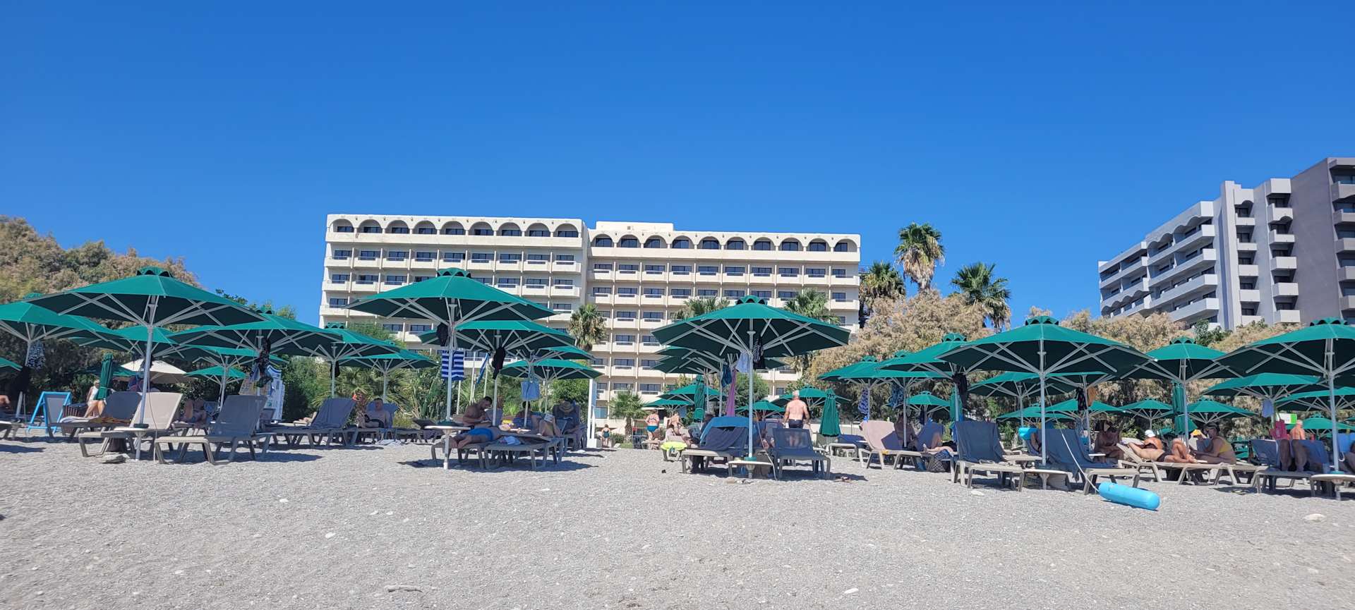 Strand mit genügend Liegen und Hotel im Hintergrund