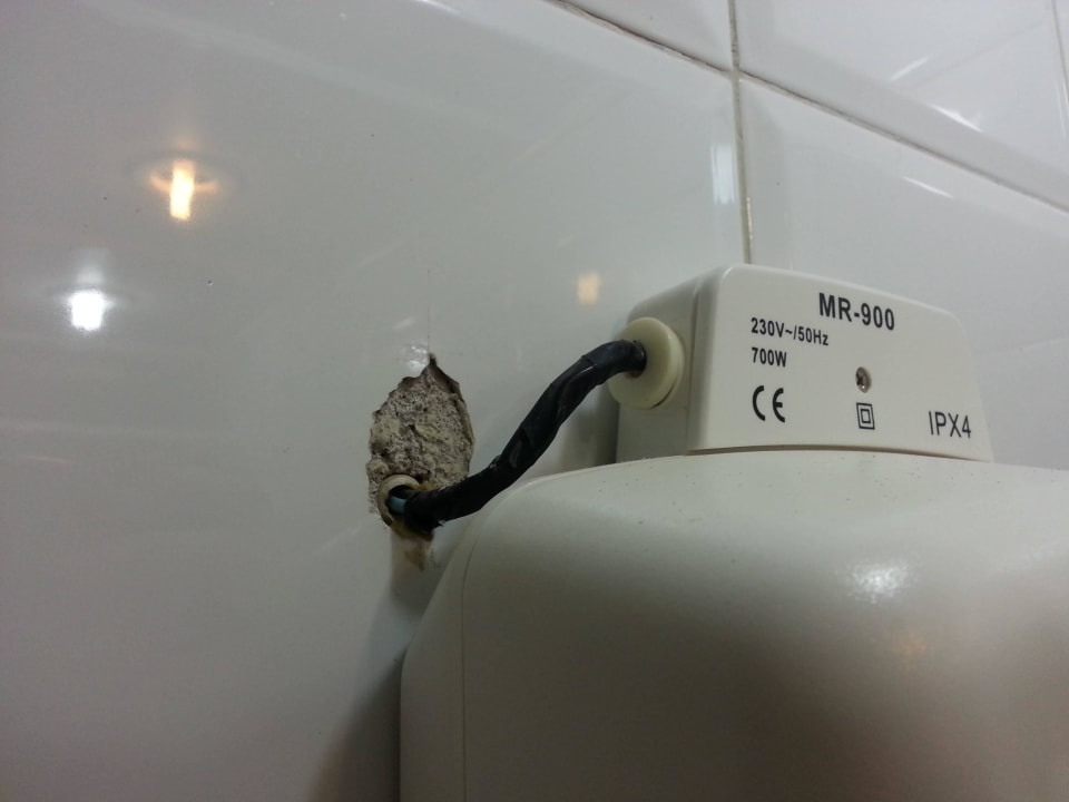 Kaputte Fliesse an der Stromleitung vom Föhn