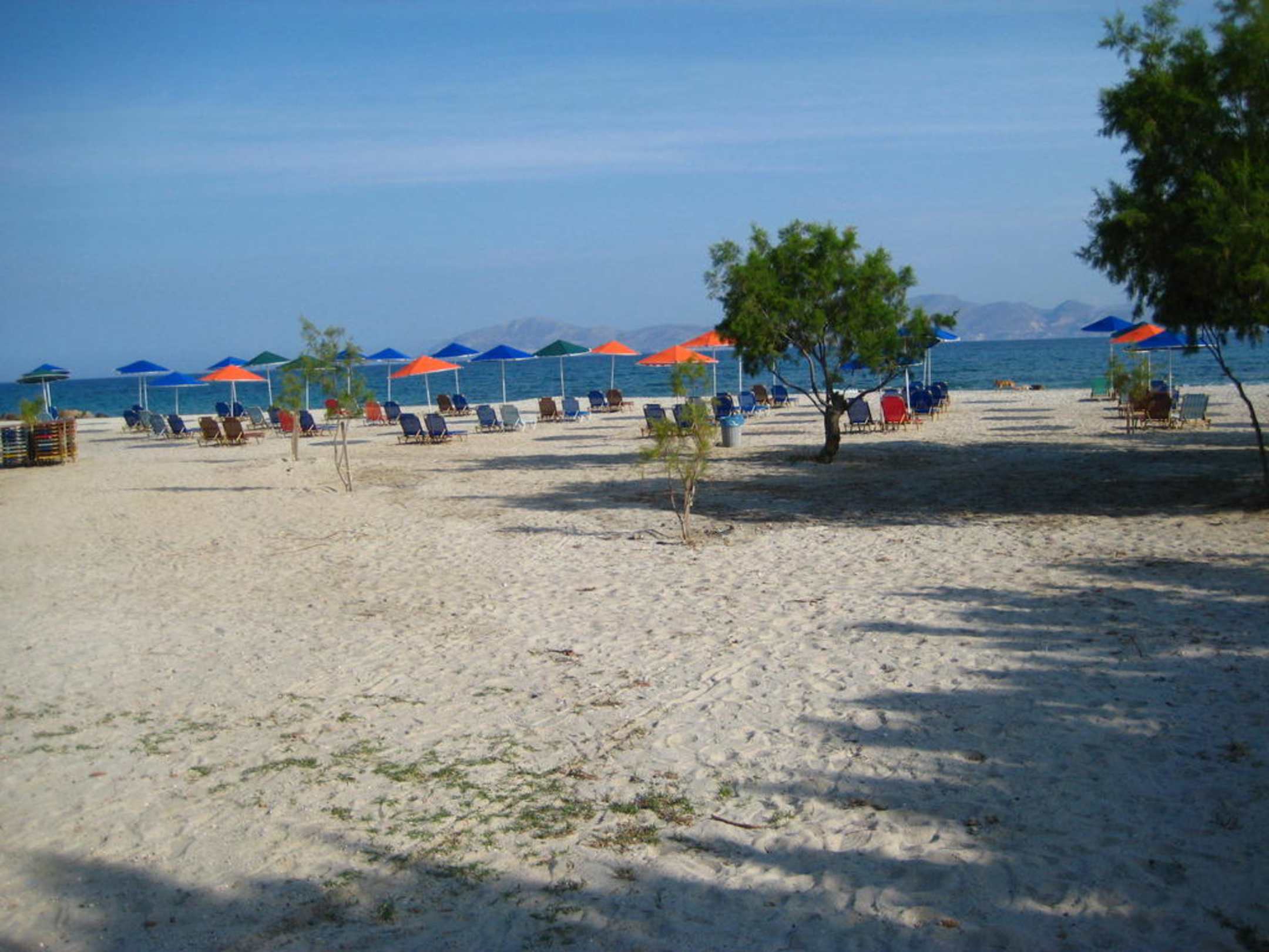 Feiner weißer Sandstrand, der sich rechts und links der Hotelanlage erstreckt mit ausreichend kostenlosen Liegen und Schirmen