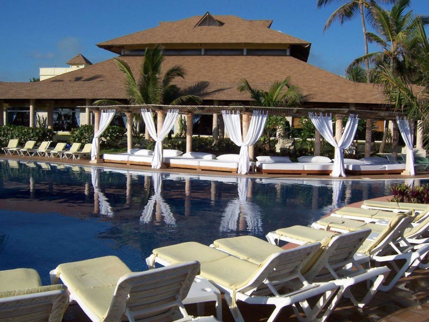 Blick über den Pool auf das Hauptrestaurant.