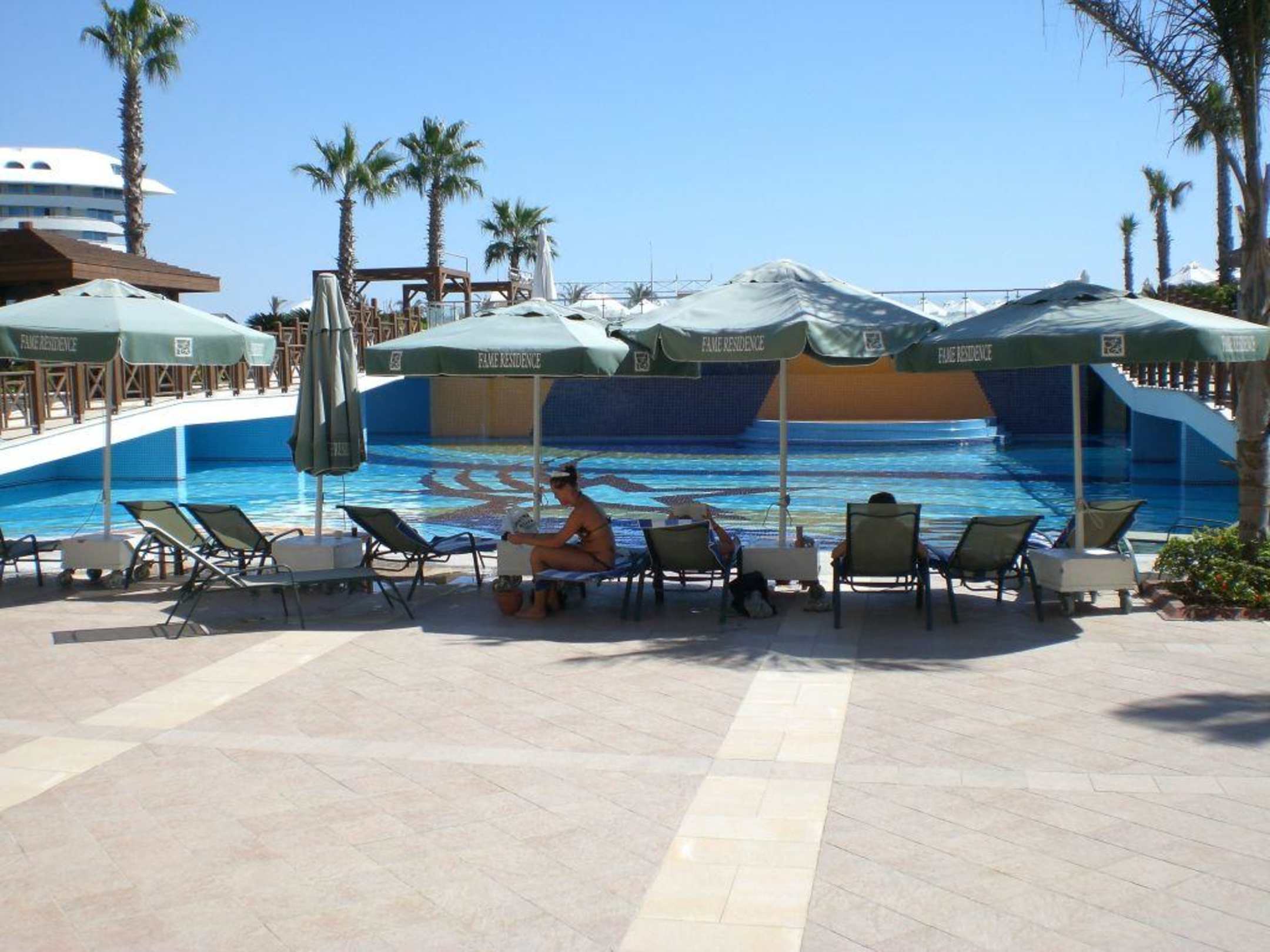 Unterste Ebene des Pools, viel freie Fläche und Gehwege drumherum, schöne Gartenanlagen. Gelungene Stein- und Fliesenauswahl, passende Schirme - alles sehr geschmackvoll.