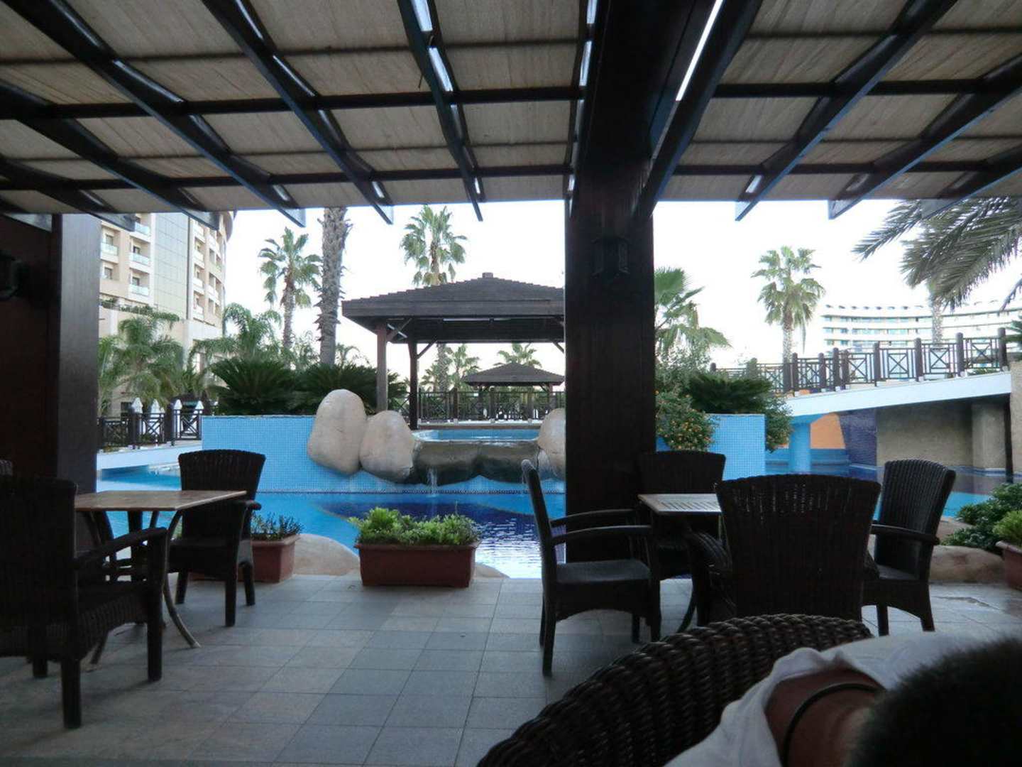 Cafe Fame Sitzgelegenheit überdachtEine der vielen Sitzgelegenheiten am Cafe Fame! Mit Blick auf einen der vielen Pools!